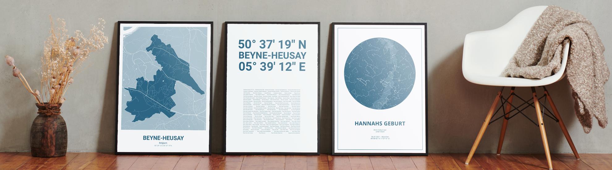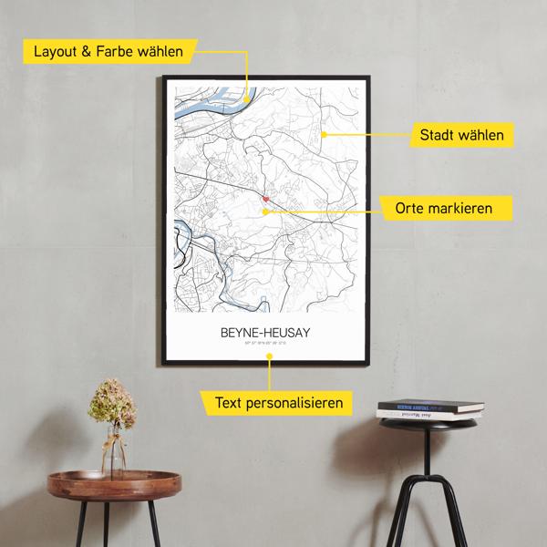 Wähle Farben und Layouts, die perfekt zu dir passen. Ob als klassische Karte in schwarz-weiß oder in modernen Farben. Bei Cartida kannst du ein Design in deinen Lieblingsfarben wählen. Erstelle eine Variante von Beyne-Heusay, die perfekt zu dir und deiner Wohnung passt.