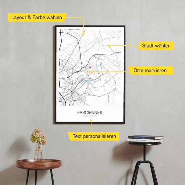 Wähle Farben und Layouts, die perfekt zu dir passen. Ob als klassische Karte in schwarz-weiß oder in modernen Farben. Bei Cartida kannst du ein Design in deinen Lieblingsfarben wählen. Erstelle eine Variante von Farciennes, die perfekt zu dir und deiner Wohnung passt.