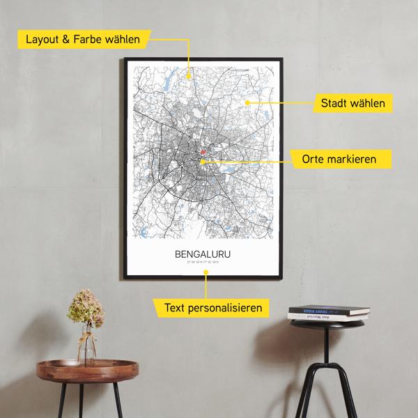 Wähle Farben und Layouts, die perfekt zu dir passen. Ob als klassische Karte in schwarz-weiß oder in modernen Farben. Bei Cartida kannst du ein Design in deinen Lieblingsfarben wählen. Erstelle eine Variante von Bengaluru, die perfekt zu dir und deiner Wohnung passt.