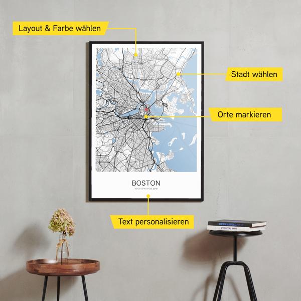 Wähle Farben und Layouts, die perfekt zu dir passen. Ob als klassische Karte in schwarz-weiß oder in modernen Farben. Bei Cartida kannst du ein Design in deinen Lieblingsfarben wählen. Erstelle eine Variante von Boston, die perfekt zu dir und deiner Wohnung passt.