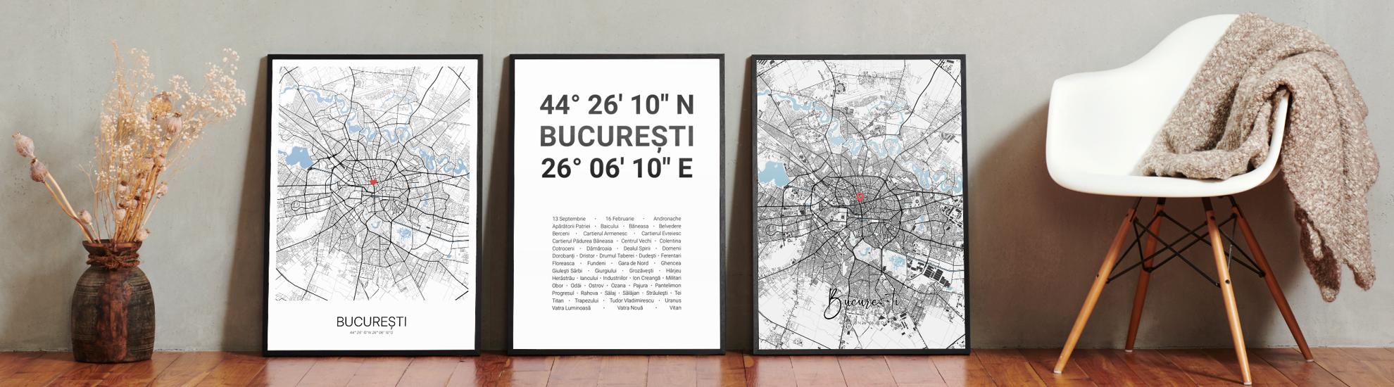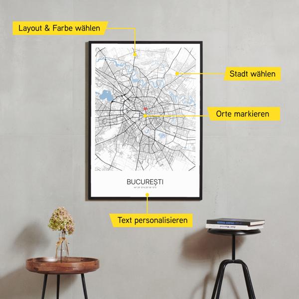 Wähle Farben und Layouts, die perfekt zu dir passen. Ob als klassische Karte in schwarz-weiß oder in modernen Farben. Bei Cartida kannst du ein Design in deinen Lieblingsfarben wählen. Erstelle eine Variante von București, die perfekt zu dir und deiner Wohnung passt.