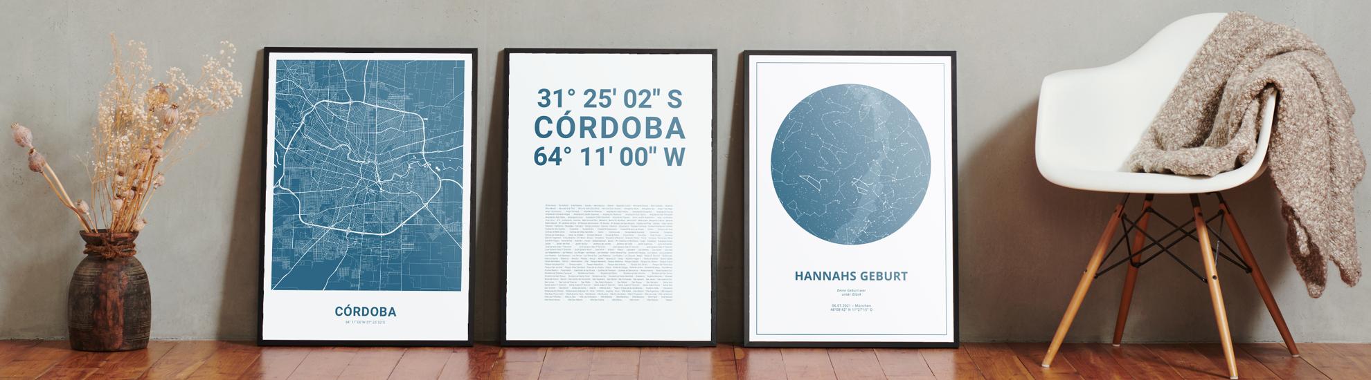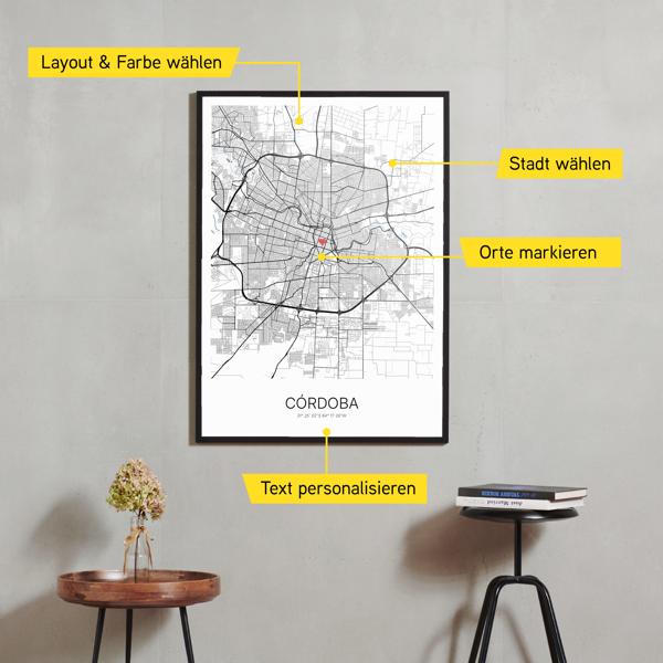 Wähle Farben und Layouts, die perfekt zu dir passen. Ob als klassische Karte in schwarz-weiß oder in modernen Farben. Bei Cartida kannst du ein Design in deinen Lieblingsfarben wählen. Erstelle eine Variante von Córdoba, die perfekt zu dir und deiner Wohnung passt.