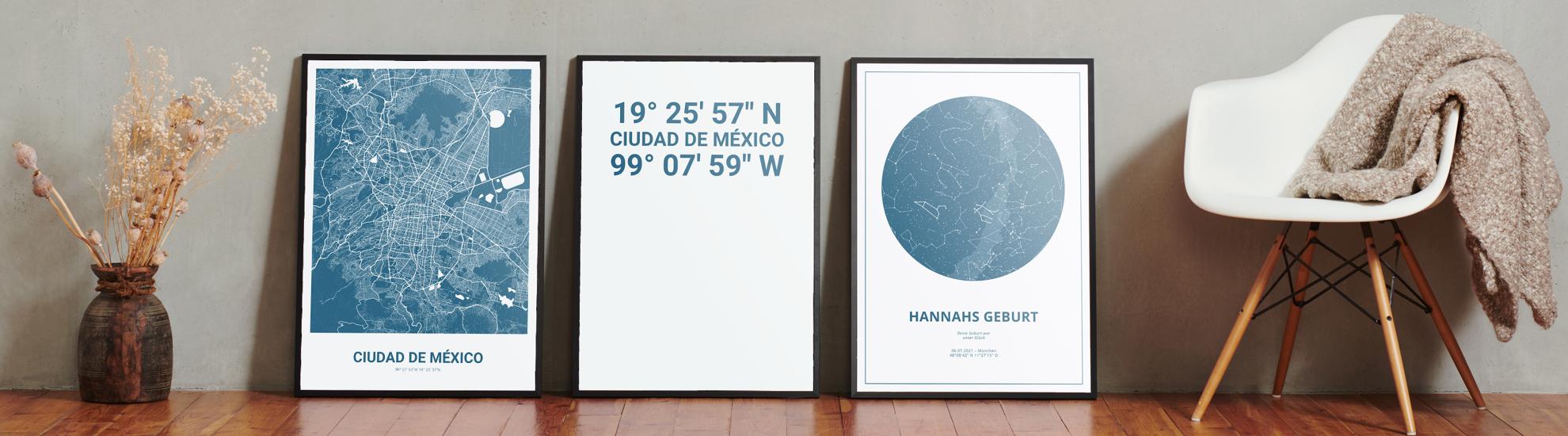 Zahlen, die die Welt bedeuten. Erstelle jetzt dein persönliches Koordinaten-Kunstwerk von deiner Lieblingsstadt. Entscheide selbst, ob Stadtteile, Straßen oder ganz eigene Texte abgedruckt werden. Perfekt als Geschenk zum Einzug oder für die eigenen vier Wände.