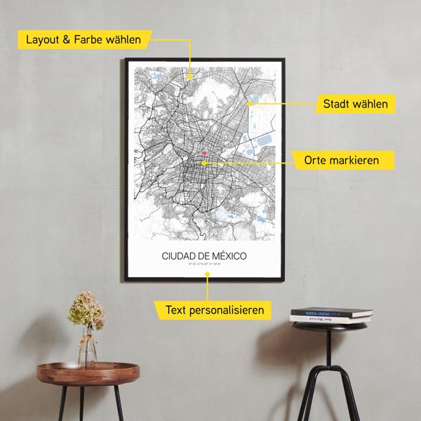 Wähle Farben und Layouts, die perfekt zu dir passen. Ob als klassische Karte in schwarz-weiß oder in modernen Farben. Bei Cartida kannst du ein Design in deinen Lieblingsfarben wählen. Erstelle eine Variante von Ciudad de México, die perfekt zu dir und deiner Wohnung passt.