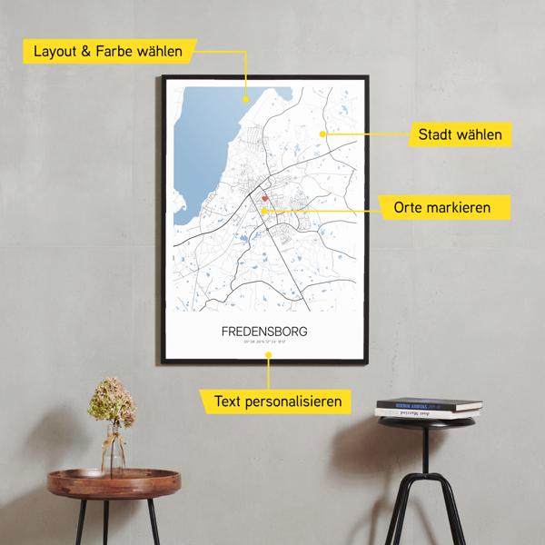 Wähle Farben und Layouts, die perfekt zu dir passen. Ob als klassische Karte in schwarz-weiß oder in modernen Farben. Bei Cartida kannst du ein Design in deinen Lieblingsfarben wählen. Erstelle eine Variante von Fredensborg, die perfekt zu dir und deiner Wohnung passt.