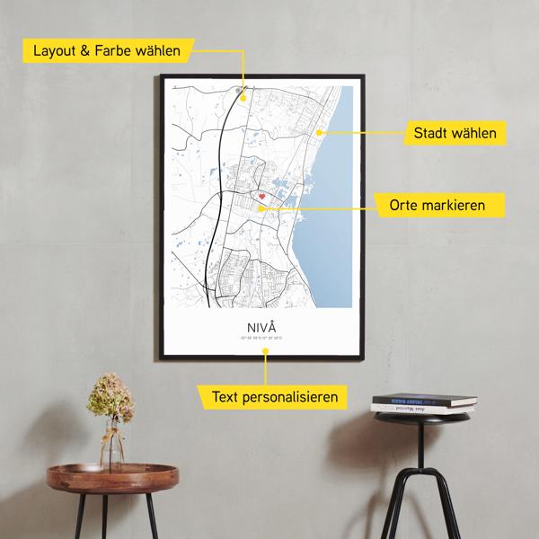 Wähle Farben und Layouts, die perfekt zu dir passen. Ob als klassische Karte in schwarz-weiß oder in modernen Farben. Bei Cartida kannst du ein Design in deinen Lieblingsfarben wählen. Erstelle eine Variante von Nivå, die perfekt zu dir und deiner Wohnung passt.