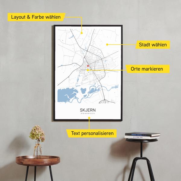 Wähle Farben und Layouts, die perfekt zu dir passen. Ob als klassische Karte in schwarz-weiß oder in modernen Farben. Bei Cartida kannst du ein Design in deinen Lieblingsfarben wählen. Erstelle eine Variante von Skjern, die perfekt zu dir und deiner Wohnung passt.