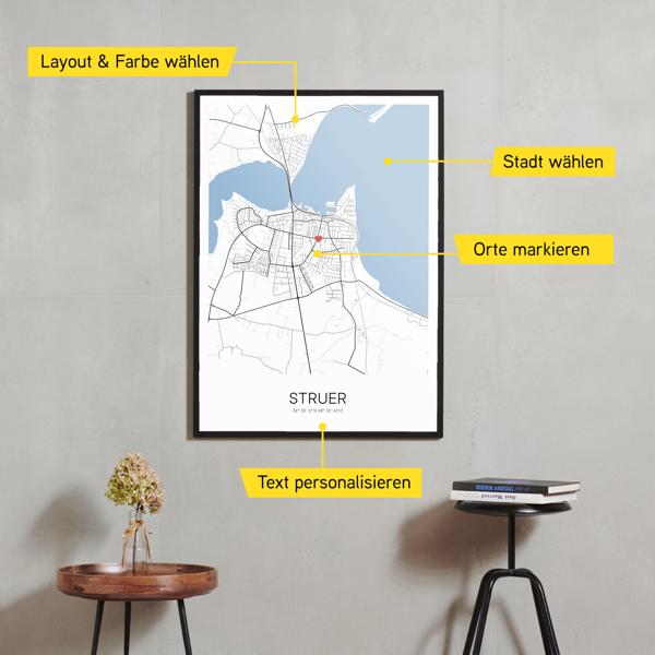 Wähle Farben und Layouts, die perfekt zu dir passen. Ob als klassische Karte in schwarz-weiß oder in modernen Farben. Bei Cartida kannst du ein Design in deinen Lieblingsfarben wählen. Erstelle eine Variante von Struer, die perfekt zu dir und deiner Wohnung passt.