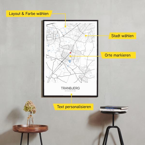 Wähle Farben und Layouts, die perfekt zu dir passen. Ob als klassische Karte in schwarz-weiß oder in modernen Farben. Bei Cartida kannst du ein Design in deinen Lieblingsfarben wählen. Erstelle eine Variante von Tranbjerg, die perfekt zu dir und deiner Wohnung passt.