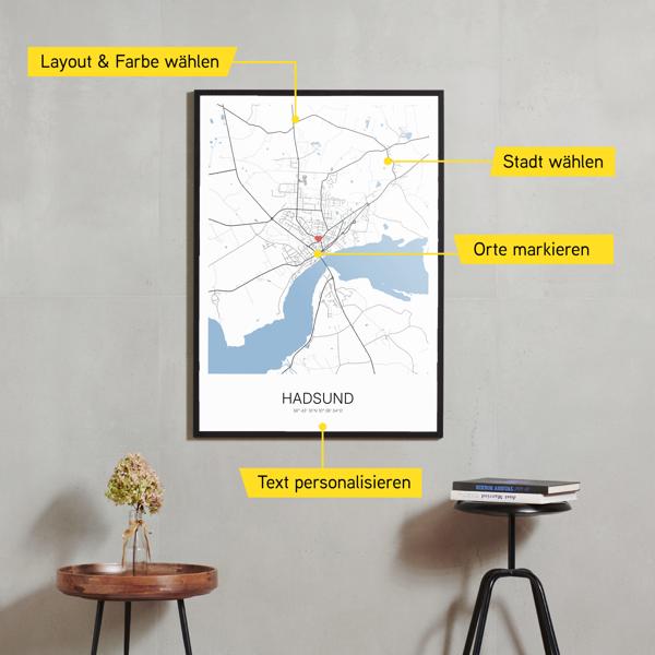 Wähle Farben und Layouts, die perfekt zu dir passen. Ob als klassische Karte in schwarz-weiß oder in modernen Farben. Bei Cartida kannst du ein Design in deinen Lieblingsfarben wählen. Erstelle eine Variante von Hadsund, die perfekt zu dir und deiner Wohnung passt.
