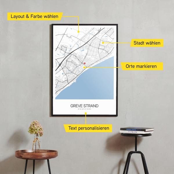 Wähle Farben und Layouts, die perfekt zu dir passen. Ob als klassische Karte in schwarz-weiß oder in modernen Farben. Bei Cartida kannst du ein Design in deinen Lieblingsfarben wählen. Erstelle eine Variante von Greve Strand, die perfekt zu dir und deiner Wohnung passt.