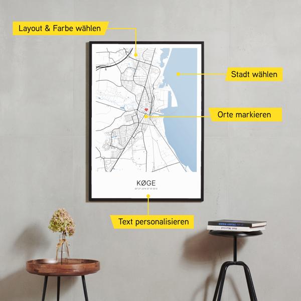 Wähle Farben und Layouts, die perfekt zu dir passen. Ob als klassische Karte in schwarz-weiß oder in modernen Farben. Bei Cartida kannst du ein Design in deinen Lieblingsfarben wählen. Erstelle eine Variante von Køge, die perfekt zu dir und deiner Wohnung passt.