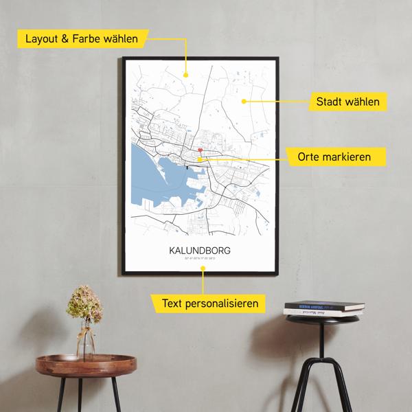 Wähle Farben und Layouts, die perfekt zu dir passen. Ob als klassische Karte in schwarz-weiß oder in modernen Farben. Bei Cartida kannst du ein Design in deinen Lieblingsfarben wählen. Erstelle eine Variante von Kalundborg, die perfekt zu dir und deiner Wohnung passt.