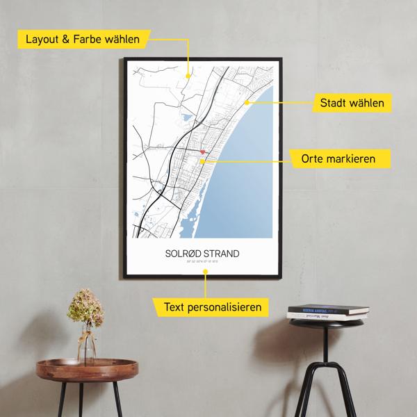 Wähle Farben und Layouts, die perfekt zu dir passen. Ob als klassische Karte in schwarz-weiß oder in modernen Farben. Bei Cartida kannst du ein Design in deinen Lieblingsfarben wählen. Erstelle eine Variante von Solrød Strand, die perfekt zu dir und deiner Wohnung passt.