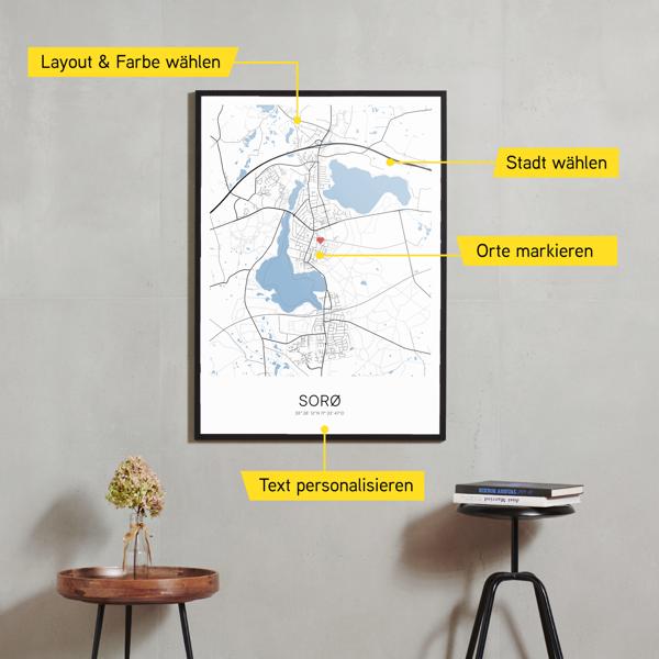 Wähle Farben und Layouts, die perfekt zu dir passen. Ob als klassische Karte in schwarz-weiß oder in modernen Farben. Bei Cartida kannst du ein Design in deinen Lieblingsfarben wählen. Erstelle eine Variante von Sorø, die perfekt zu dir und deiner Wohnung passt.
