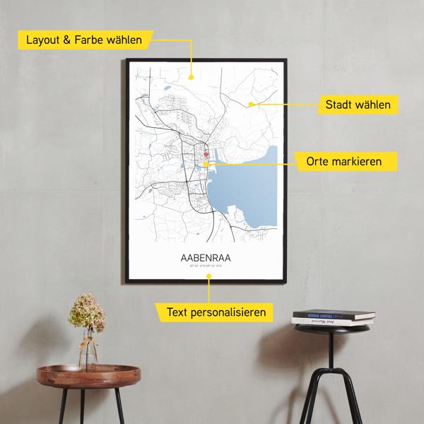 Wähle Farben und Layouts, die perfekt zu dir passen. Ob als klassische Karte in schwarz-weiß oder in modernen Farben. Bei Cartida kannst du ein Design in deinen Lieblingsfarben wählen. Erstelle eine Variante von Aabenraa, die perfekt zu dir und deiner Wohnung passt.