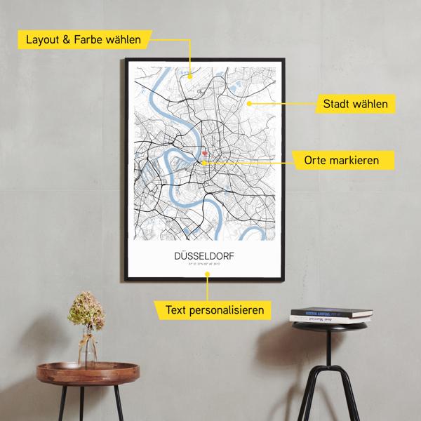 Wähle Farben und Layouts, die perfekt zu dir passen. Ob als klassische Karte in schwarz-weiß oder in modernen Farben. Bei Cartida kannst du ein Design in deinen Lieblingsfarben wählen. Erstelle eine Variante von Düsseldorf, die perfekt zu dir und deiner Wohnung passt.
