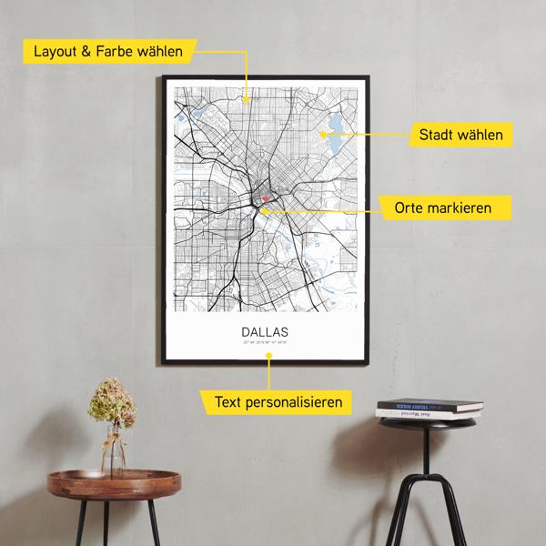 Wähle Farben und Layouts, die perfekt zu dir passen. Ob als klassische Karte in schwarz-weiß oder in modernen Farben. Bei Cartida kannst du ein Design in deinen Lieblingsfarben wählen. Erstelle eine Variante von Dallas, die perfekt zu dir und deiner Wohnung passt.