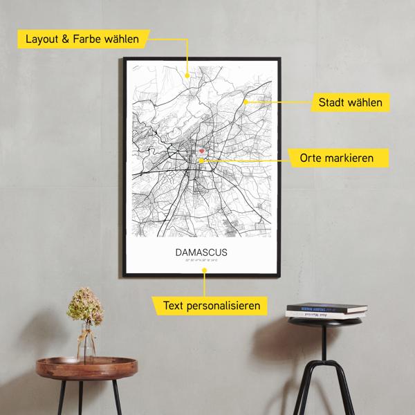 Wähle Farben und Layouts, die perfekt zu dir passen. Ob als klassische Karte in schwarz-weiß oder in modernen Farben. Bei Cartida kannst du ein Design in deinen Lieblingsfarben wählen. Erstelle eine Variante von Damascus, die perfekt zu dir und deiner Wohnung passt.