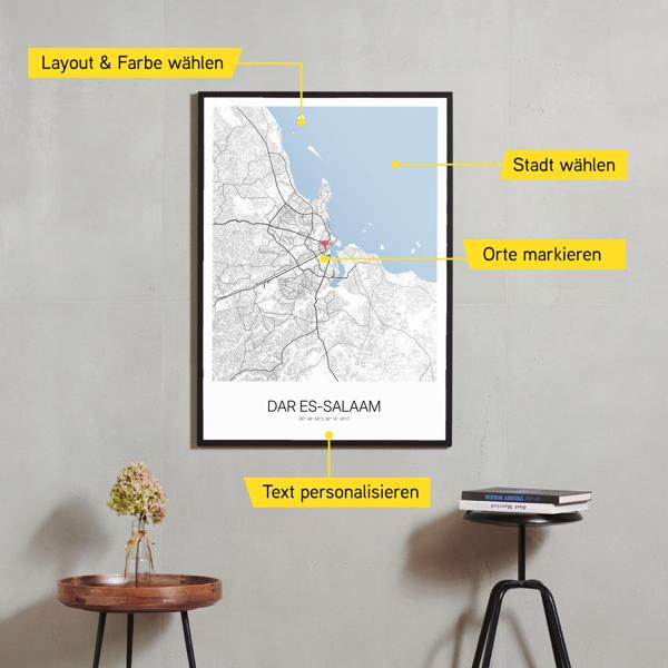 Wähle Farben und Layouts, die perfekt zu dir passen. Ob als klassische Karte in schwarz-weiß oder in modernen Farben. Bei Cartida kannst du ein Design in deinen Lieblingsfarben wählen. Erstelle eine Variante von Dar es-Salaam, die perfekt zu dir und deiner Wohnung passt.