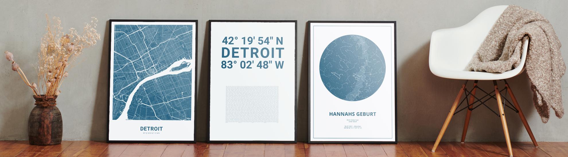 Wähle Farben und Layouts, die perfekt zu dir passen. Ob als klassische Karte in schwarz-weiß oder in modernen Farben. Bei Cartida kannst du ein Design in deinen Lieblingsfarben wählen. Erstelle eine Variante von Detroit, die perfekt zu dir und deiner Wohnung passt.