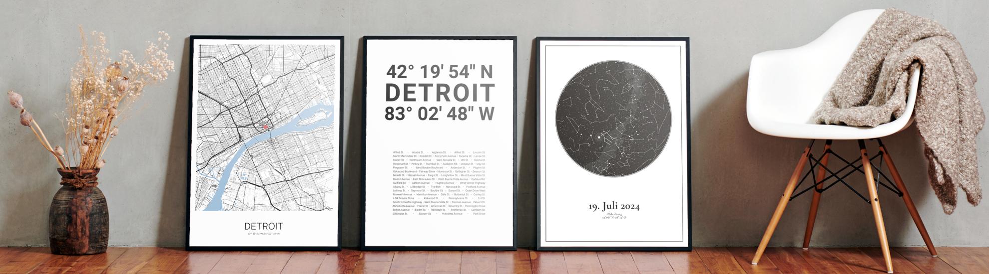 Wähle Farben und Layouts, die perfekt zu dir passen. Ob als klassische Karte in schwarz-weiß oder in modernen Farben. Bei Cartida kannst du ein Design in deinen Lieblingsfarben wählen. Erstelle eine Variante von Detroit, die perfekt zu dir und deiner Wohnung passt.