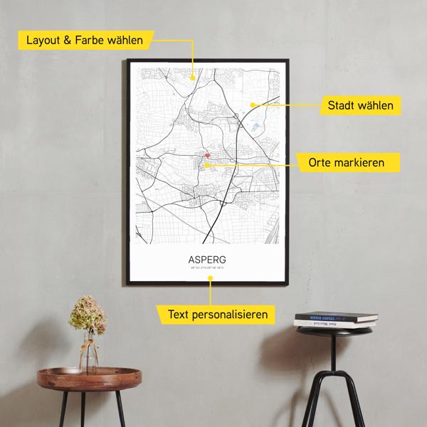 Wähle Farben und Layouts, die perfekt zu dir passen. Ob als klassische Karte in schwarz-weiß oder in modernen Farben. Bei Cartida kannst du ein Design in deinen Lieblingsfarben wählen. Erstelle eine Variante von Asperg, die perfekt zu dir und deiner Wohnung passt.