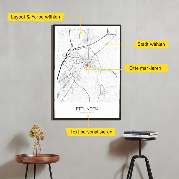 Wähle Farben und Layouts, die perfekt zu dir passen. Ob als klassische Karte in schwarz-weiß oder in modernen Farben. Bei Cartida kannst du ein Design in deinen Lieblingsfarben wählen. Erstelle eine Variante von Ettlingen, die perfekt zu dir und deiner Wohnung passt.