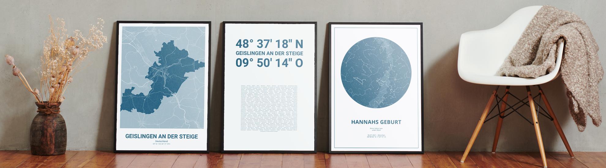 Zahlen, die die Welt bedeuten. Erstelle jetzt dein persönliches Koordinaten-Kunstwerk von deiner Lieblingsstadt. Entscheide selbst, ob Stadtteile, Straßen oder ganz eigene Texte abgedruckt werden. Perfekt als Geschenk zum Einzug oder für die eigenen vier Wände.