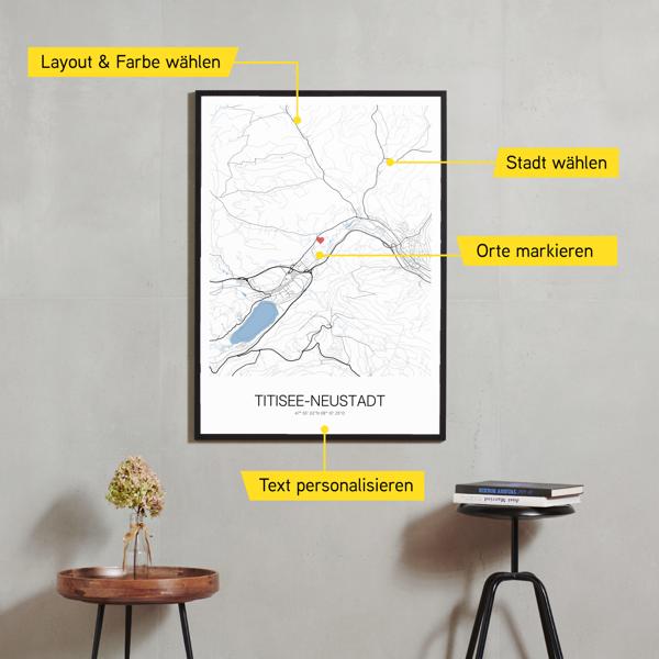 Wähle Farben und Layouts, die perfekt zu dir passen. Ob als klassische Karte in schwarz-weiß oder in modernen Farben. Bei Cartida kannst du ein Design in deinen Lieblingsfarben wählen. Erstelle eine Variante von Titisee-Neustadt, die perfekt zu dir und deiner Wohnung passt.