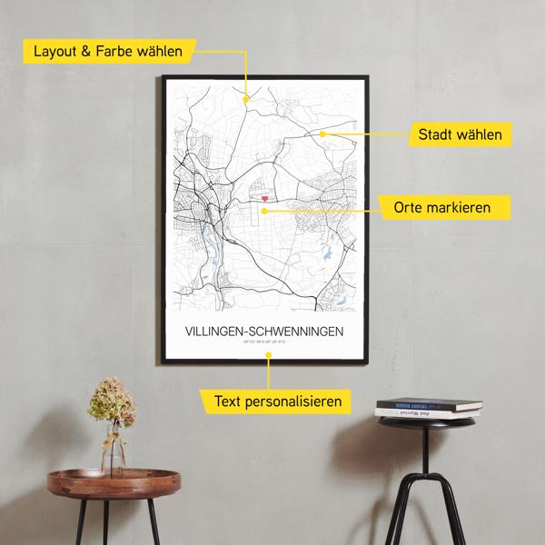 Wähle Farben und Layouts, die perfekt zu dir passen. Ob als klassische Karte in schwarz-weiß oder in modernen Farben. Bei Cartida kannst du ein Design in deinen Lieblingsfarben wählen. Erstelle eine Variante von Villingen-Schwenningen, die perfekt zu dir und deiner Wohnung passt.