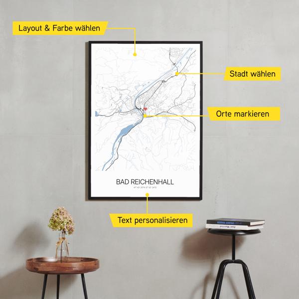 Wähle Farben und Layouts, die perfekt zu dir passen. Ob als klassische Karte in schwarz-weiß oder in modernen Farben. Bei Cartida kannst du ein Design in deinen Lieblingsfarben wählen. Erstelle eine Variante von Bad Reichenhall, die perfekt zu dir und deiner Wohnung passt.