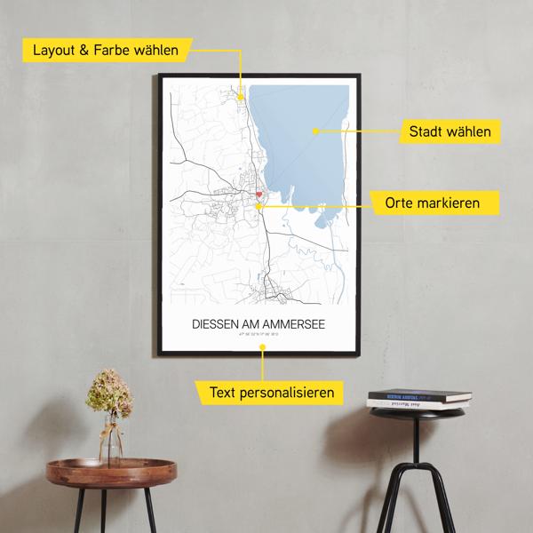 Wähle Farben und Layouts, die perfekt zu dir passen. Ob als klassische Karte in schwarz-weiß oder in modernen Farben. Bei Cartida kannst du ein Design in deinen Lieblingsfarben wählen. Erstelle eine Variante von Dießen am Ammersee, die perfekt zu dir und deiner Wohnung passt.