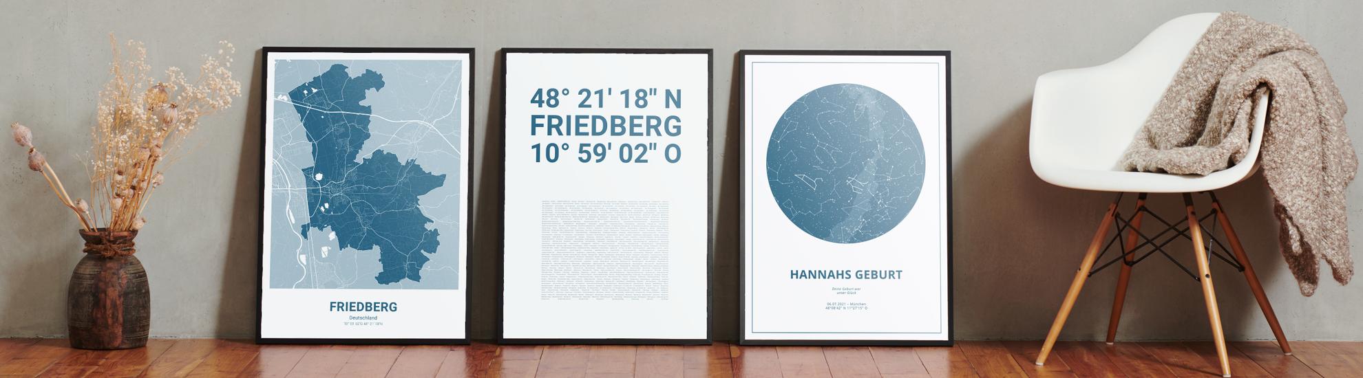 Wähle Farben und Layouts, die perfekt zu dir passen. Ob als klassische Karte in schwarz-weiß oder in modernen Farben. Bei Cartida kannst du ein Design in deinen Lieblingsfarben wählen. Erstelle eine Variante von Friedberg, die perfekt zu dir und deiner Wohnung passt.