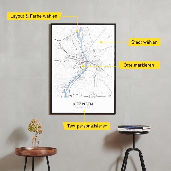 Wähle Farben und Layouts, die perfekt zu dir passen. Ob als klassische Karte in schwarz-weiß oder in modernen Farben. Bei Cartida kannst du ein Design in deinen Lieblingsfarben wählen. Erstelle eine Variante von Kitzingen, die perfekt zu dir und deiner Wohnung passt.