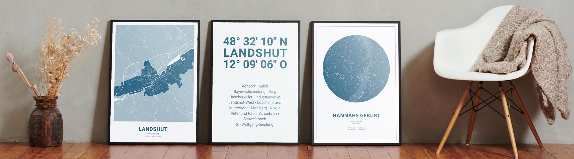 Wähle Farben und Layouts, die perfekt zu dir passen. Ob als klassische Karte in schwarz-weiß oder in modernen Farben. Bei Cartida kannst du ein Design in deinen Lieblingsfarben wählen. Erstelle eine Variante von Landshut, die perfekt zu dir und deiner Wohnung passt.