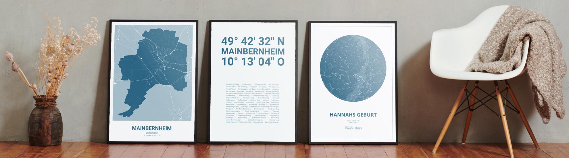 Wähle Farben und Layouts, die perfekt zu dir passen. Ob als klassische Karte in schwarz-weiß oder in modernen Farben. Bei Cartida kannst du ein Design in deinen Lieblingsfarben wählen. Erstelle eine Variante von Mainbernheim, die perfekt zu dir und deiner Wohnung passt.