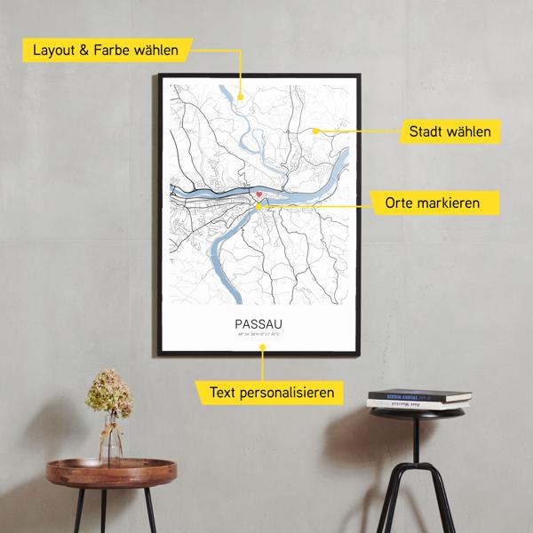 Wähle Farben und Layouts, die perfekt zu dir passen. Ob als klassische Karte in schwarz-weiß oder in modernen Farben. Bei Cartida kannst du ein Design in deinen Lieblingsfarben wählen. Erstelle eine Variante von Passau, die perfekt zu dir und deiner Wohnung passt.