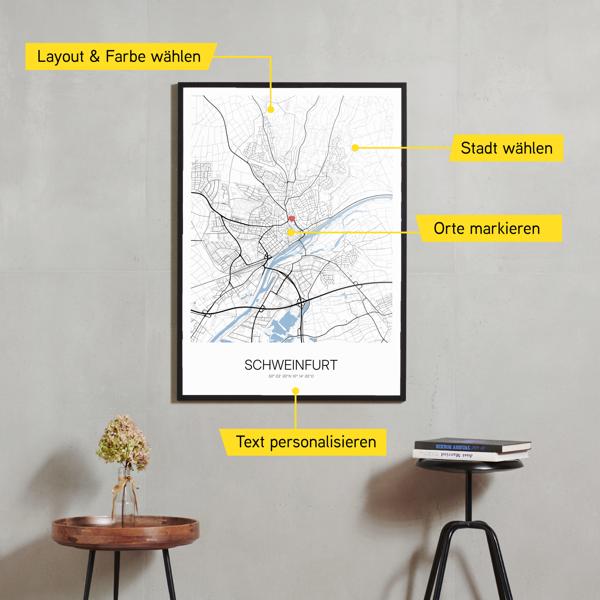 Wähle Farben und Layouts, die perfekt zu dir passen. Ob als klassische Karte in schwarz-weiß oder in modernen Farben. Bei Cartida kannst du ein Design in deinen Lieblingsfarben wählen. Erstelle eine Variante von Schweinfurt, die perfekt zu dir und deiner Wohnung passt.