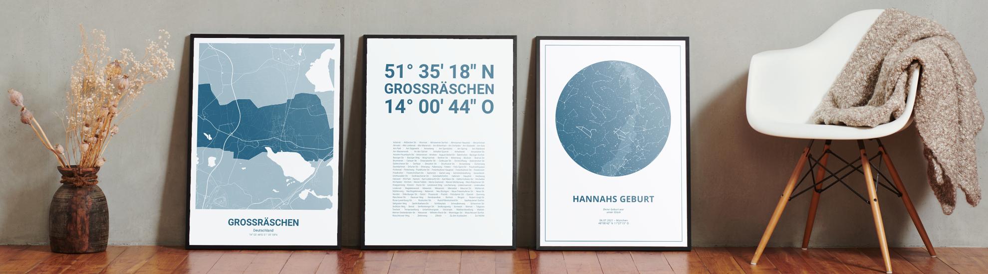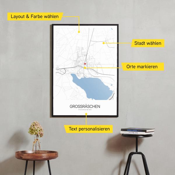 Wähle Farben und Layouts, die perfekt zu dir passen. Ob als klassische Karte in schwarz-weiß oder in modernen Farben. Bei Cartida kannst du ein Design in deinen Lieblingsfarben wählen. Erstelle eine Variante von Großräschen, die perfekt zu dir und deiner Wohnung passt.