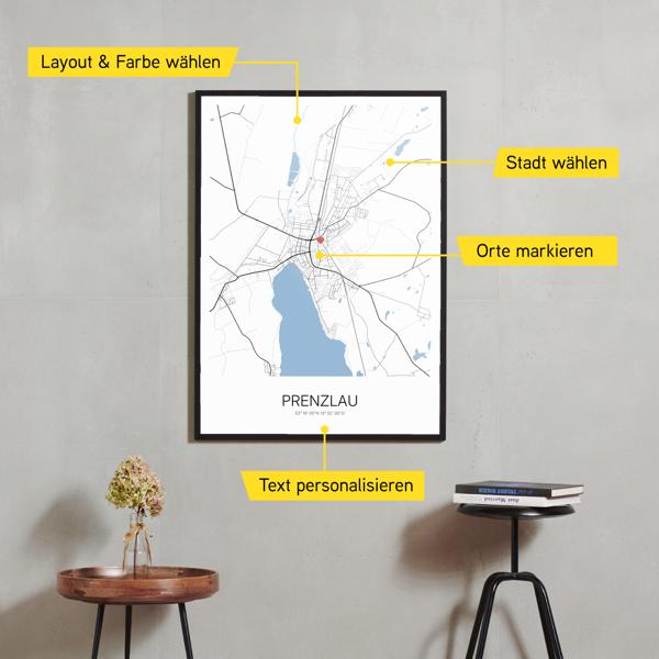 Wähle Farben und Layouts, die perfekt zu dir passen. Ob als klassische Karte in schwarz-weiß oder in modernen Farben. Bei Cartida kannst du ein Design in deinen Lieblingsfarben wählen. Erstelle eine Variante von Prenzlau, die perfekt zu dir und deiner Wohnung passt.