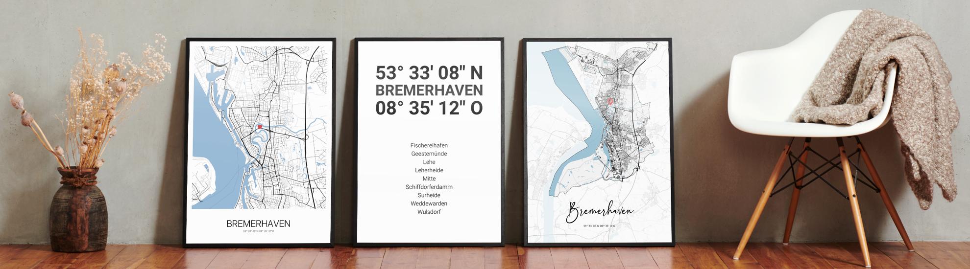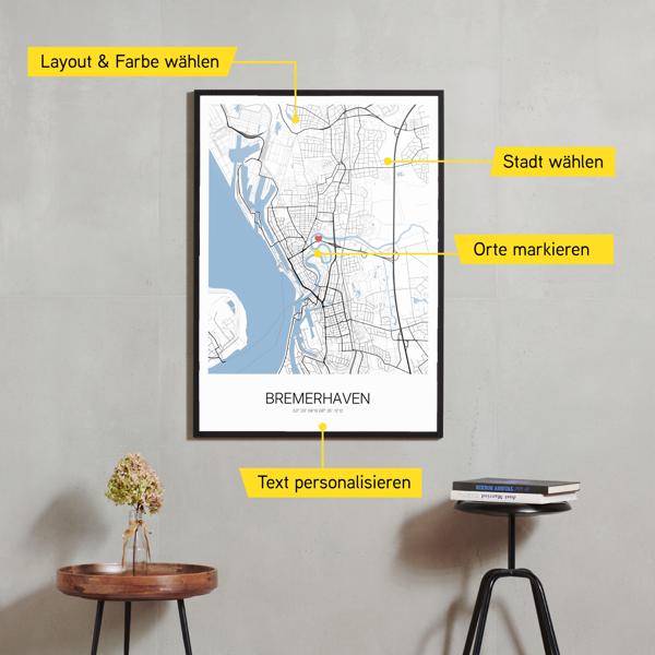 Wähle Farben und Layouts, die perfekt zu dir passen. Ob als klassische Karte in schwarz-weiß oder in modernen Farben. Bei Cartida kannst du ein Design in deinen Lieblingsfarben wählen. Erstelle eine Variante von Bremerhaven, die perfekt zu dir und deiner Wohnung passt.
