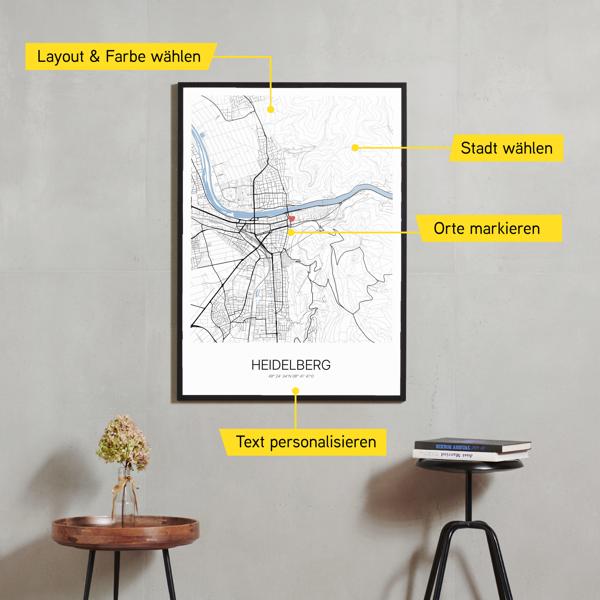 Wähle Farben und Layouts, die perfekt zu dir passen. Ob als klassische Karte in schwarz-weiß oder in modernen Farben. Bei Cartida kannst du ein Design in deinen Lieblingsfarben wählen. Erstelle eine Variante von Heidelberg, die perfekt zu dir und deiner Wohnung passt.