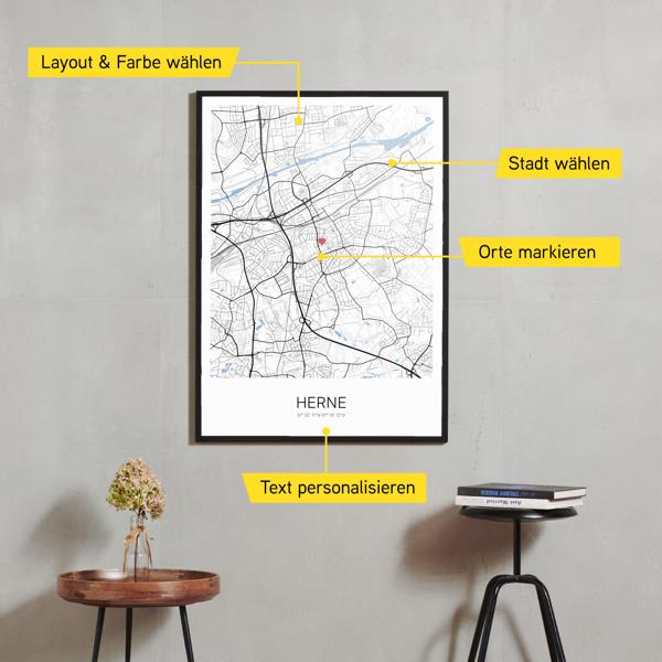 Wähle Farben und Layouts, die perfekt zu dir passen. Ob als klassische Karte in schwarz-weiß oder in modernen Farben. Bei Cartida kannst du ein Design in deinen Lieblingsfarben wählen. Erstelle eine Variante von Herne, die perfekt zu dir und deiner Wohnung passt.