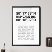 Zahlen, die die Welt bedeuten. Erstelle jetzt dein persönliches Koordinaten-Kunstwerk von deiner Lieblingsstadt. Entscheide selbst, ob Stadtteile, Straßen oder ganz eigene Texte abgedruckt werden. Perfekt als Geschenk zum Einzug oder für die eigenen vier Wände.