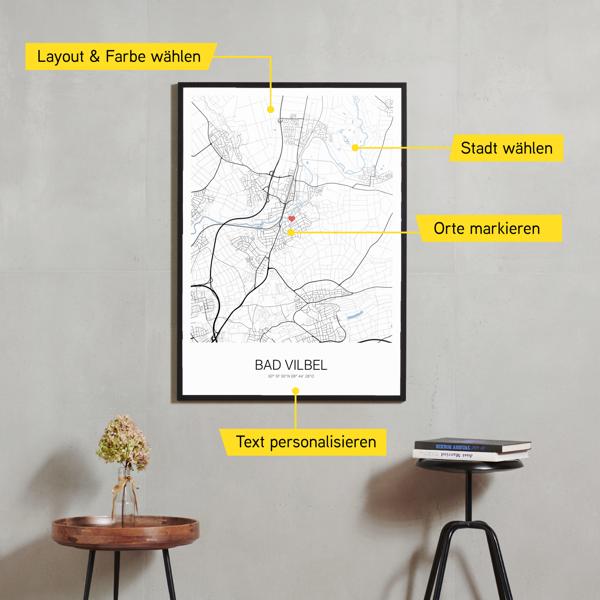 Wähle Farben und Layouts, die perfekt zu dir passen. Ob als klassische Karte in schwarz-weiß oder in modernen Farben. Bei Cartida kannst du ein Design in deinen Lieblingsfarben wählen. Erstelle eine Variante von Bad Vilbel, die perfekt zu dir und deiner Wohnung passt.