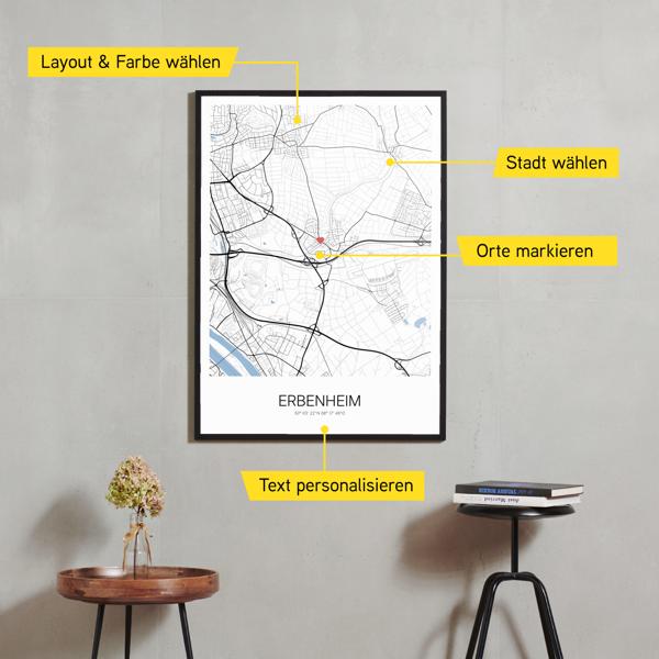 Wähle Farben und Layouts, die perfekt zu dir passen. Ob als klassische Karte in schwarz-weiß oder in modernen Farben. Bei Cartida kannst du ein Design in deinen Lieblingsfarben wählen. Erstelle eine Variante von Erbenheim, die perfekt zu dir und deiner Wohnung passt.