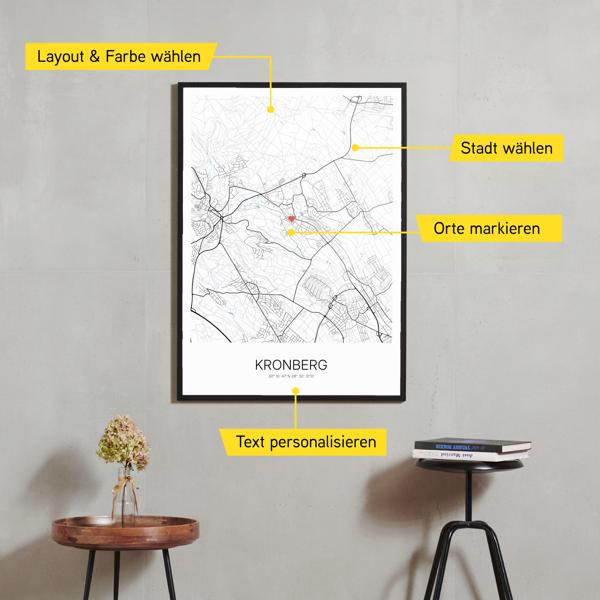 Wähle Farben und Layouts, die perfekt zu dir passen. Ob als klassische Karte in schwarz-weiß oder in modernen Farben. Bei Cartida kannst du ein Design in deinen Lieblingsfarben wählen. Erstelle eine Variante von Kronberg, die perfekt zu dir und deiner Wohnung passt.