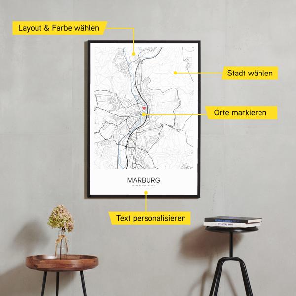 Wähle Farben und Layouts, die perfekt zu dir passen. Ob als klassische Karte in schwarz-weiß oder in modernen Farben. Bei Cartida kannst du ein Design in deinen Lieblingsfarben wählen. Erstelle eine Variante von Marburg, die perfekt zu dir und deiner Wohnung passt.