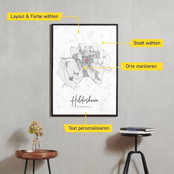 Wähle Farben und Layouts, die perfekt zu dir passen. Ob als klassische Karte in schwarz-weiß oder in modernen Farben. Bei Cartida kannst du ein Design in deinen Lieblingsfarben wählen. Erstelle eine Variante von Hildesheim, die perfekt zu dir und deiner Wohnung passt.